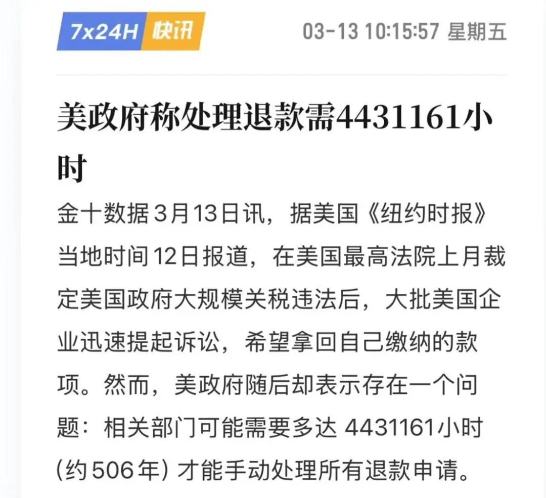 结果现在,法院判了这笔钱收得违法,要退钱了,美国政府突然就“系统瘫痪”了,突然就“不会算数”了,突然就“只能手动处理”了,告诉所有企业:对不起,退款要等506年。