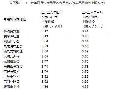 智通财经APP获悉,3月25日,香港机电工程署宣布,按专用石油气加气站(专用气站)的合约规条,调整专用气站在2026年四月一日至四月三十日期间的车用石油气上限价格。机电工程署发言人说:2026年四月一日的调整反映2026年三月的国际石油气价格变动。经调整后,各专用气站车用石油气的上限价格为每公升3.42至4.36港元不等,升幅为每公升零至0.01港元。