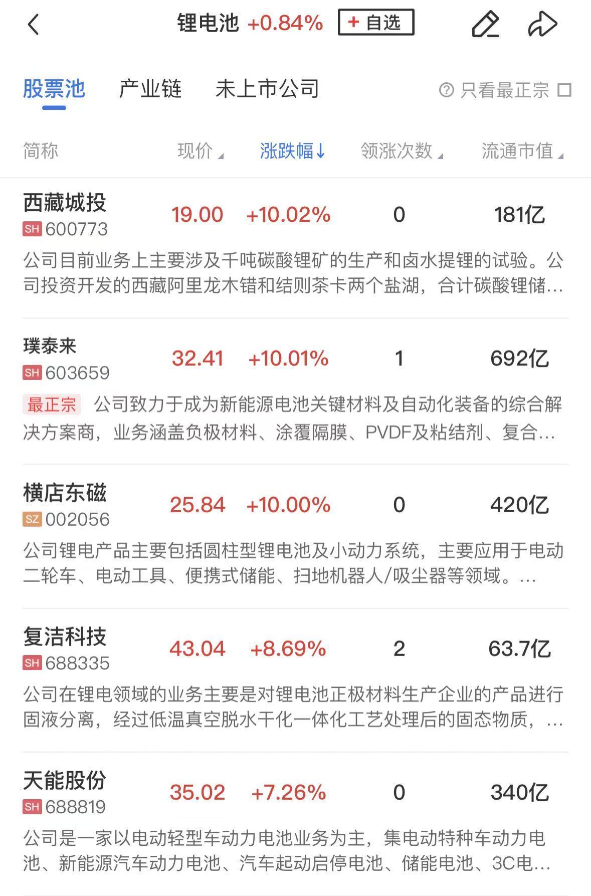 锂电池材料方向同样走高,负极、电解液方向领涨,璞泰来涨停,天能股份、尚太科技、恩捷股份、科恒股份、维科技术等涨幅居前。