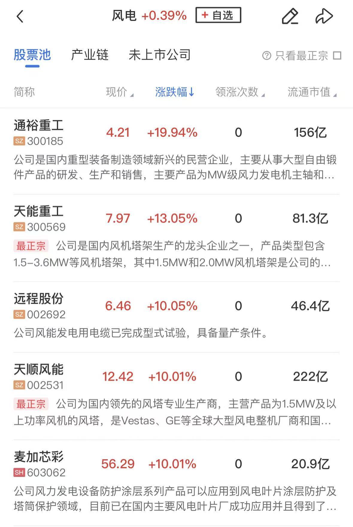 风电股再度涨幅居前,通裕重工、天顺风能涨停,天能重工、大金重工、威力传动、电气风电等涨幅居前。